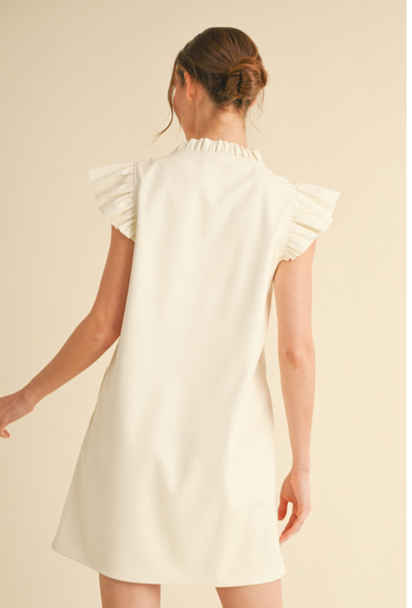 Fake leather dress with slit frilled neck, ruffly cap sleeves, and side pockets.