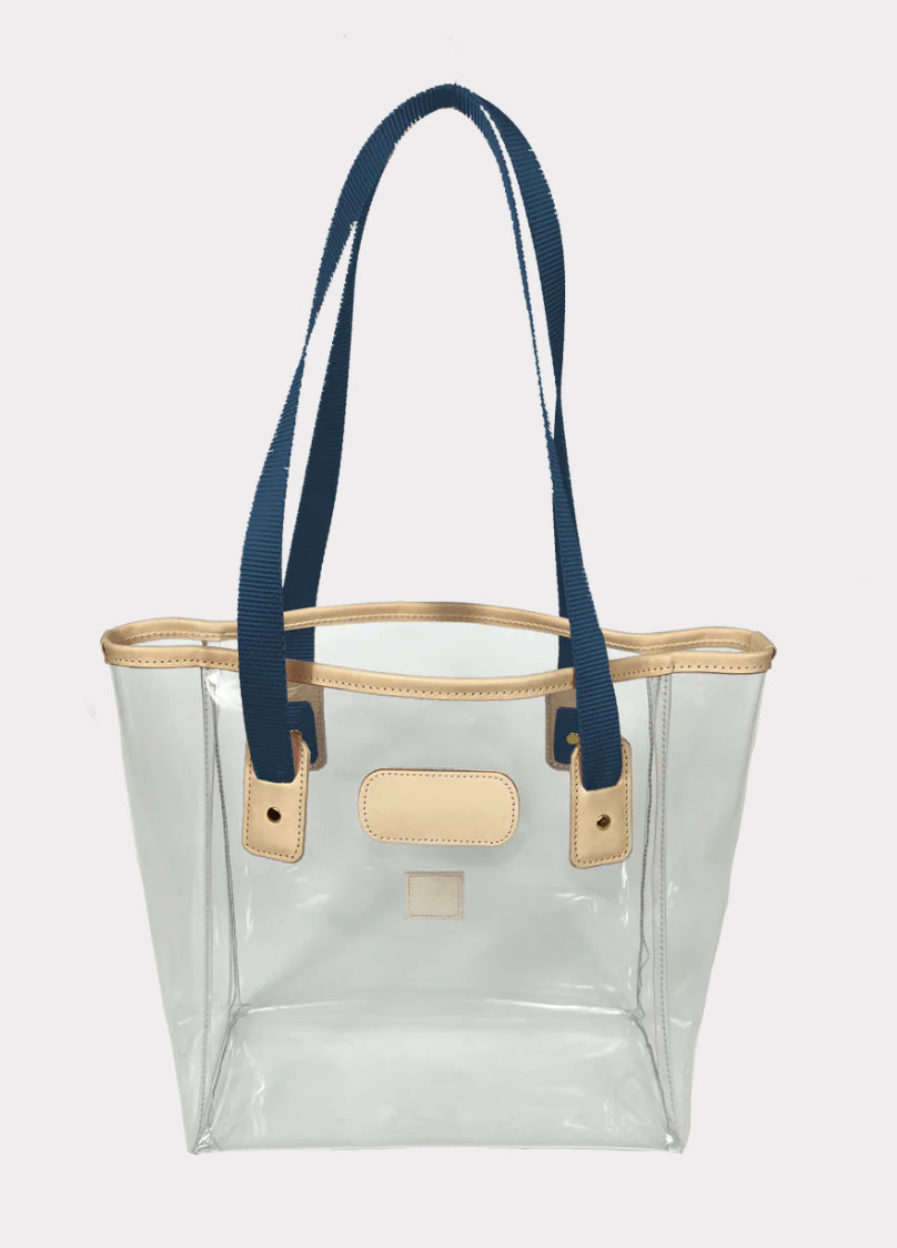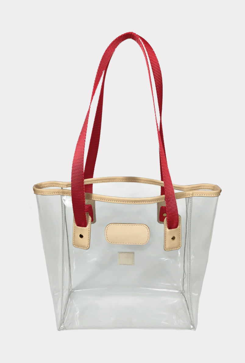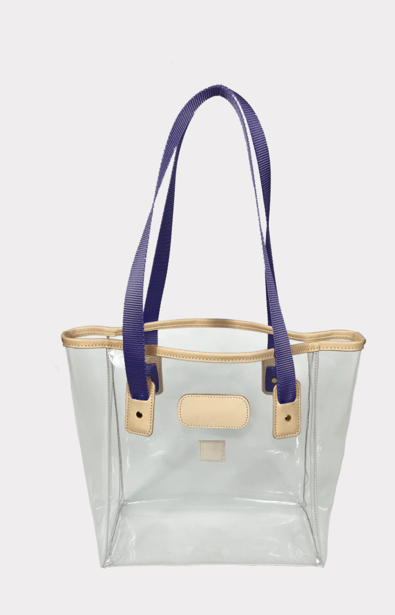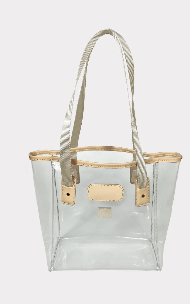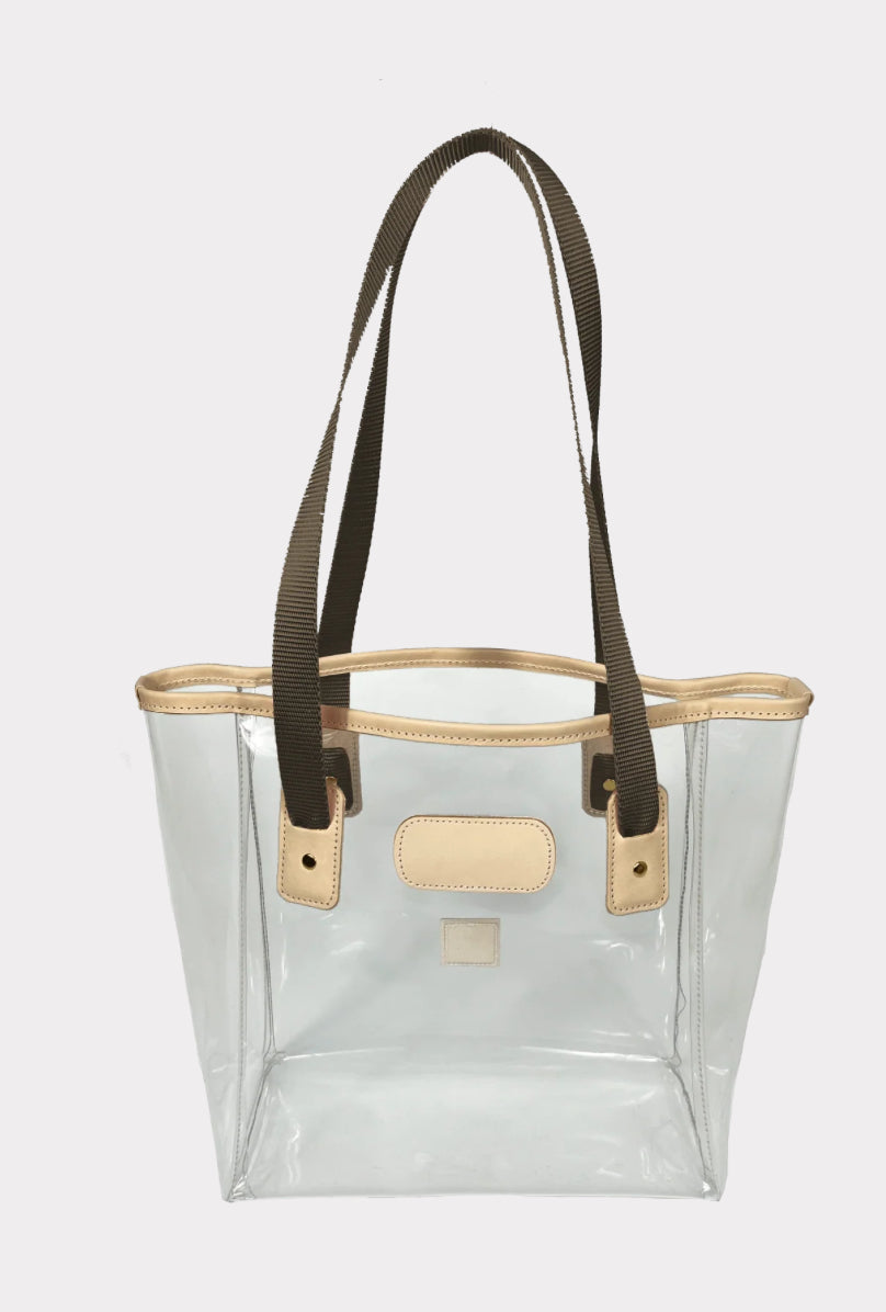 The perfect bag to take on the tour of your life. Constructed of clear plastic, trimmed in all-natural leather, with webbing handles. This bag is stadium compliant.